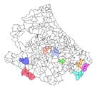 Carta tematica regionale di perimetrazione degli ambiti territoriali di gestione. Sono stati individuati 8 Ambiti Territoriali all'interno dei quali sono stati sovrapposti i layers che indicano la viabilità, le risorse idriche naturali disponibili (invasi, specchi liquidi, sorgenti e pozzi), acquedotti (partitori, serbatoi, fontanili), reti elettriche, metanodotti, ecc.